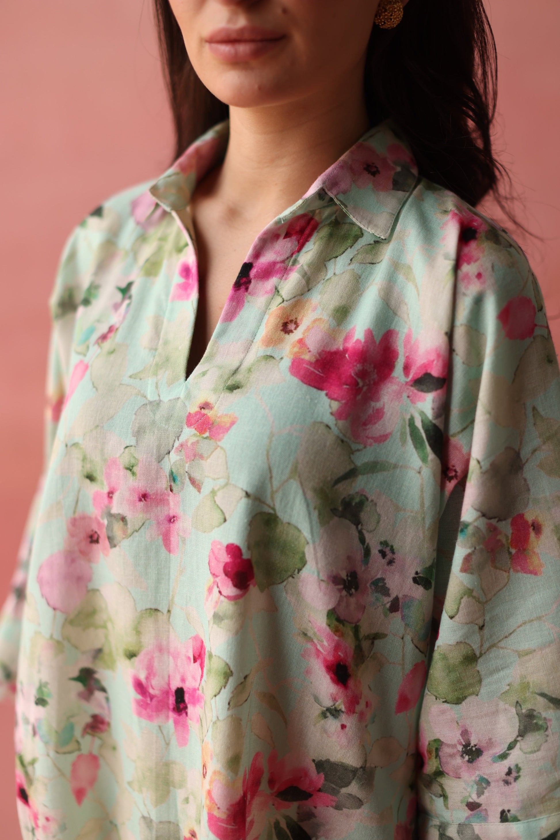 The Kairos Kaftan is a combination of the classic kaftan silhouette, with loose and flowing cuts with the sleeves and floral prints, along with the comfort of linen fabric, providing both elegance and ease of movement. It can be paired with our Easy Day pants.