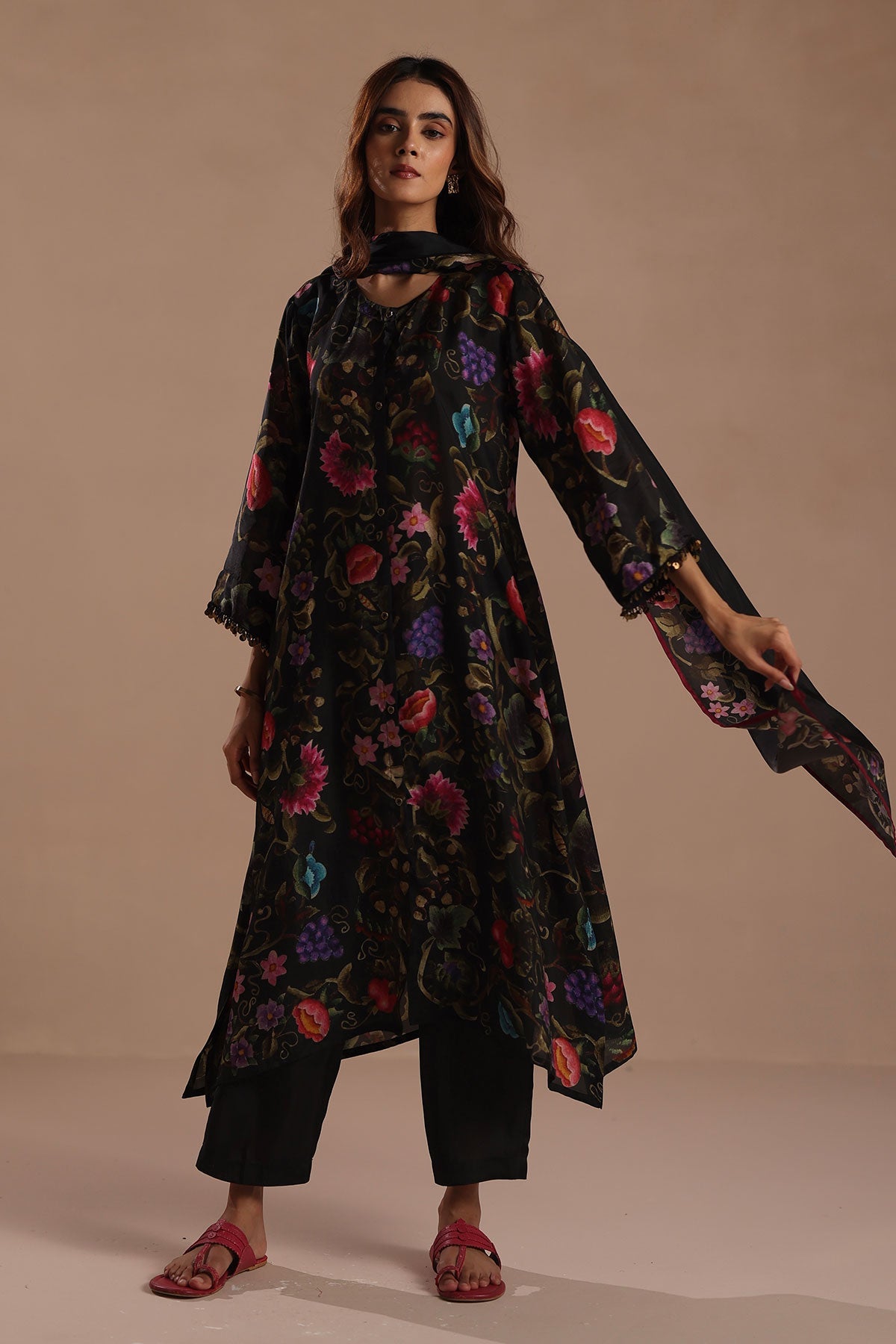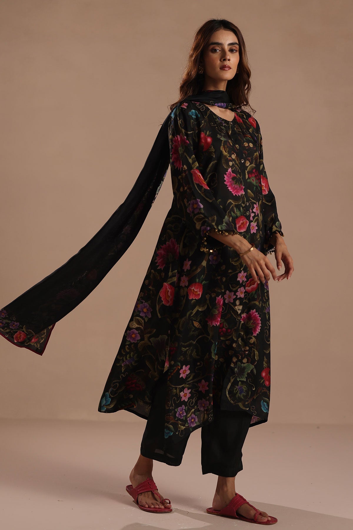 A black Habutai silk stole with floral prints four sided border and a magenta accents, designed to complement the Vine kurta set.