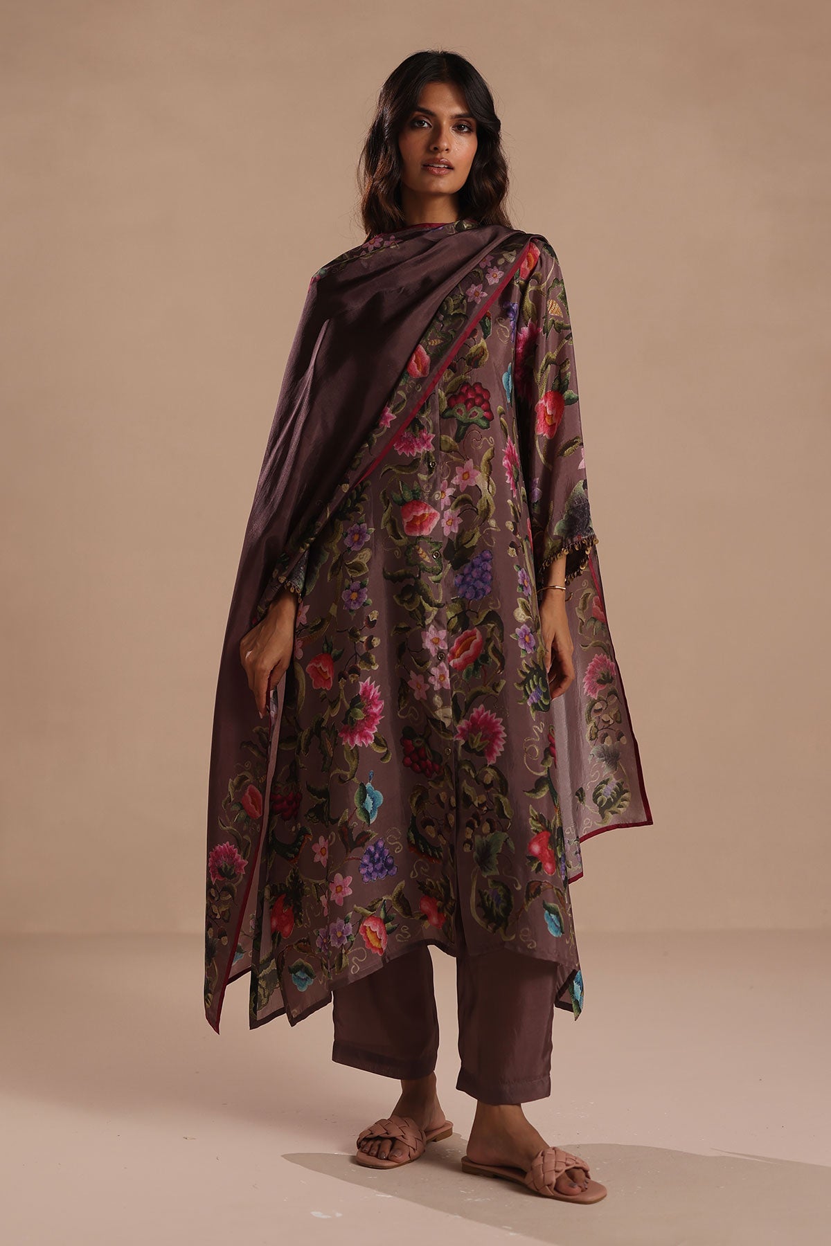 A plum Habutai silk stole with floral prints four sided border and a magenta accents, designed to complement the Vine kurta set.