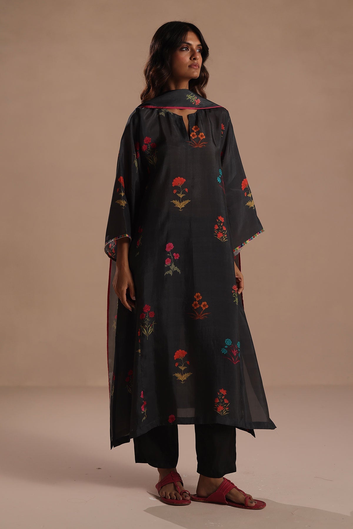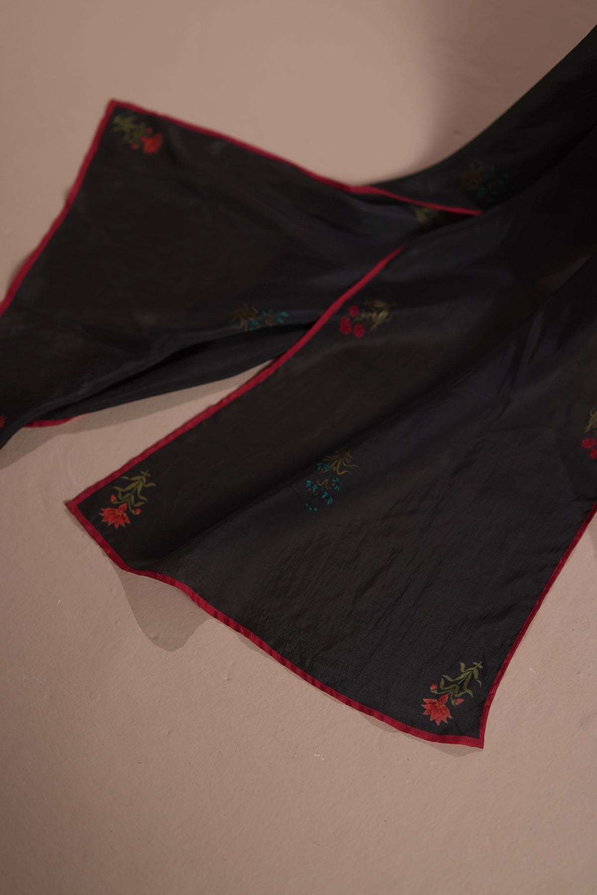 A soft Habutai silk stole with a contrasting pink border and floral watercolor motifs. Lightweight and luxurious, it’s the perfect accent for refined styling.